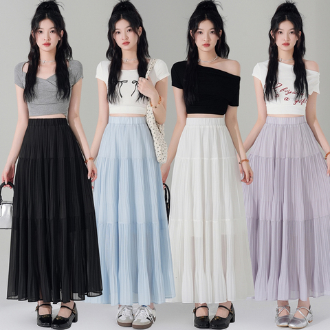 Falda de gasa de cintura alta de Color sólido elegante de verano para mujer XS Simple plisado largo Delgado transpirable cómodo suave ajustable